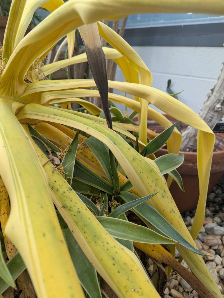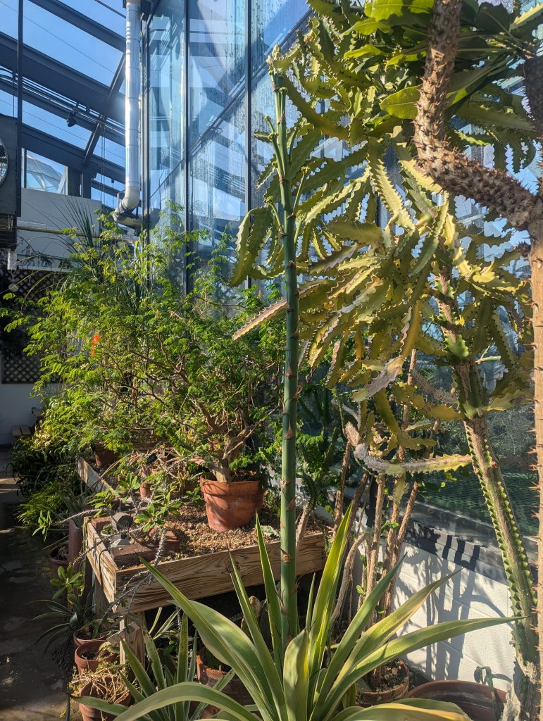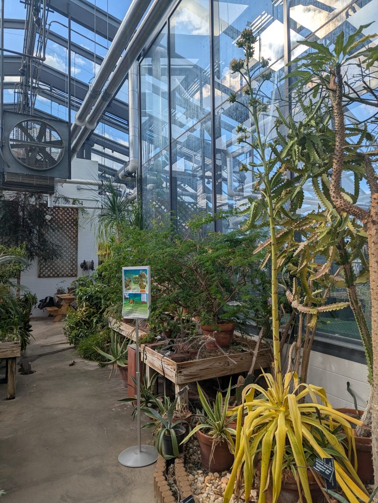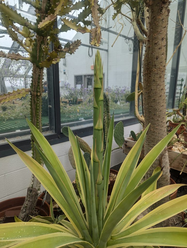 For Century Plants, the beginning of the bloom cycle represents the final days of its long life. Most Century Plants live between 25-40 years. While we are sad to say goodbye to this Century Plant, we are left with an abundance of its pups which are genetic clones of the mother plant and are clustered at its base. Once the mother plant has been cut back, we will repot the pups saving some for the greenhouse and distributing the remainder to others around campus.