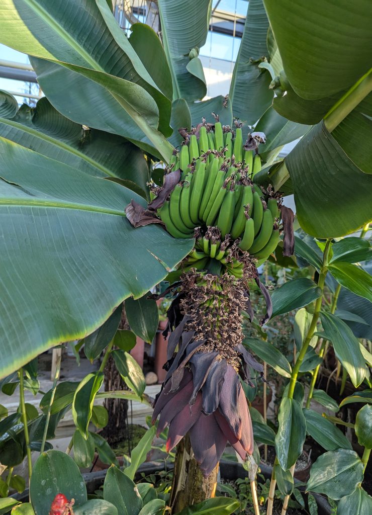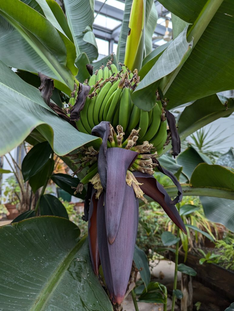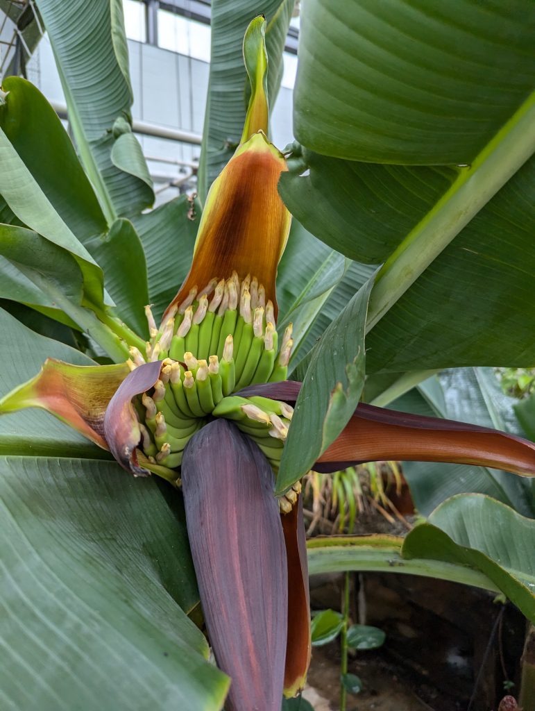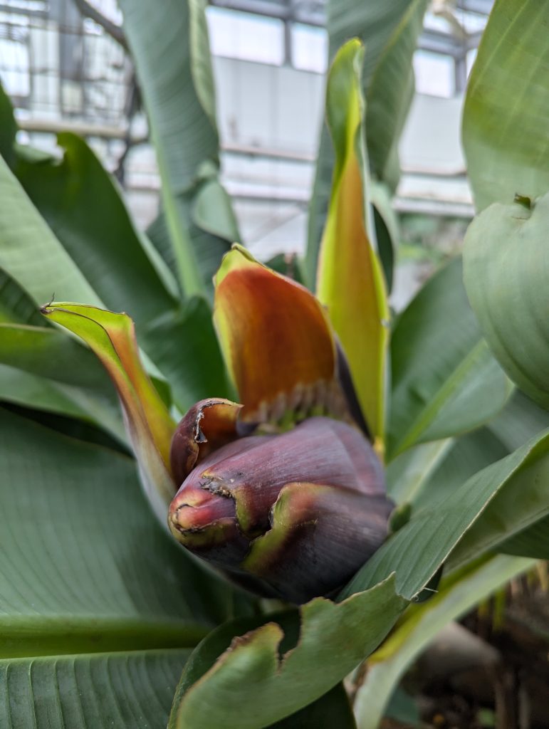 We are excited to share that one of our dwarf banana plants began flowering in early December of 2024! Over the past two months the flower has continued to open and reveal tiny bananas which are maturing and increasing in number weekly.