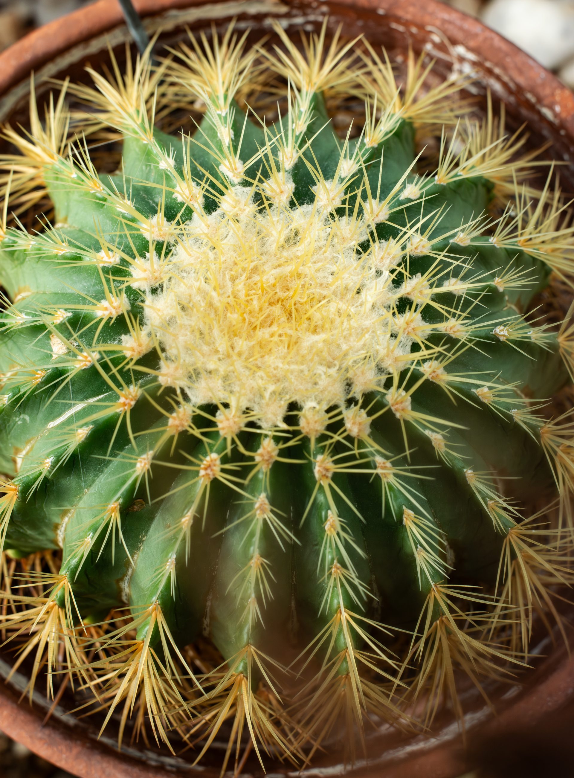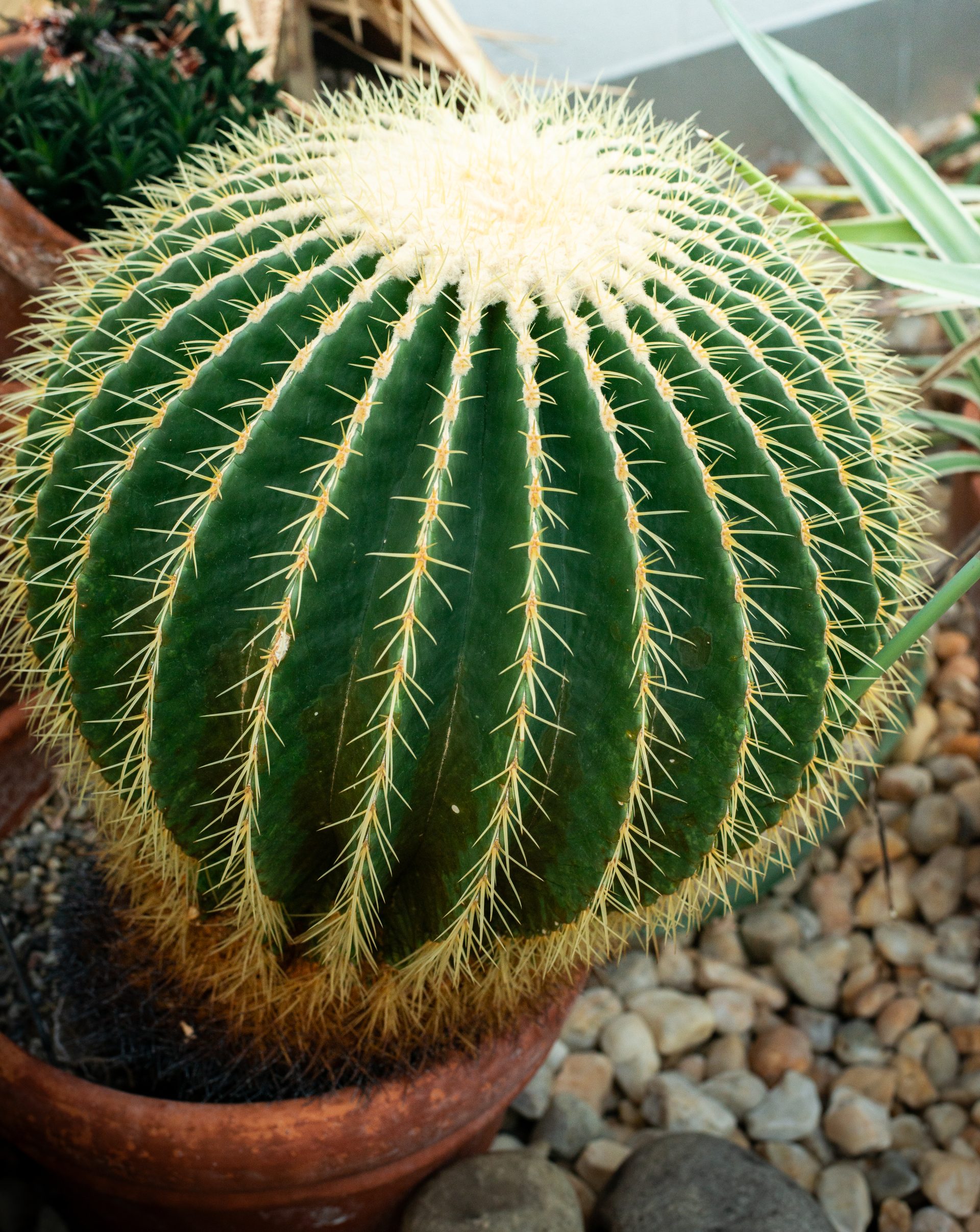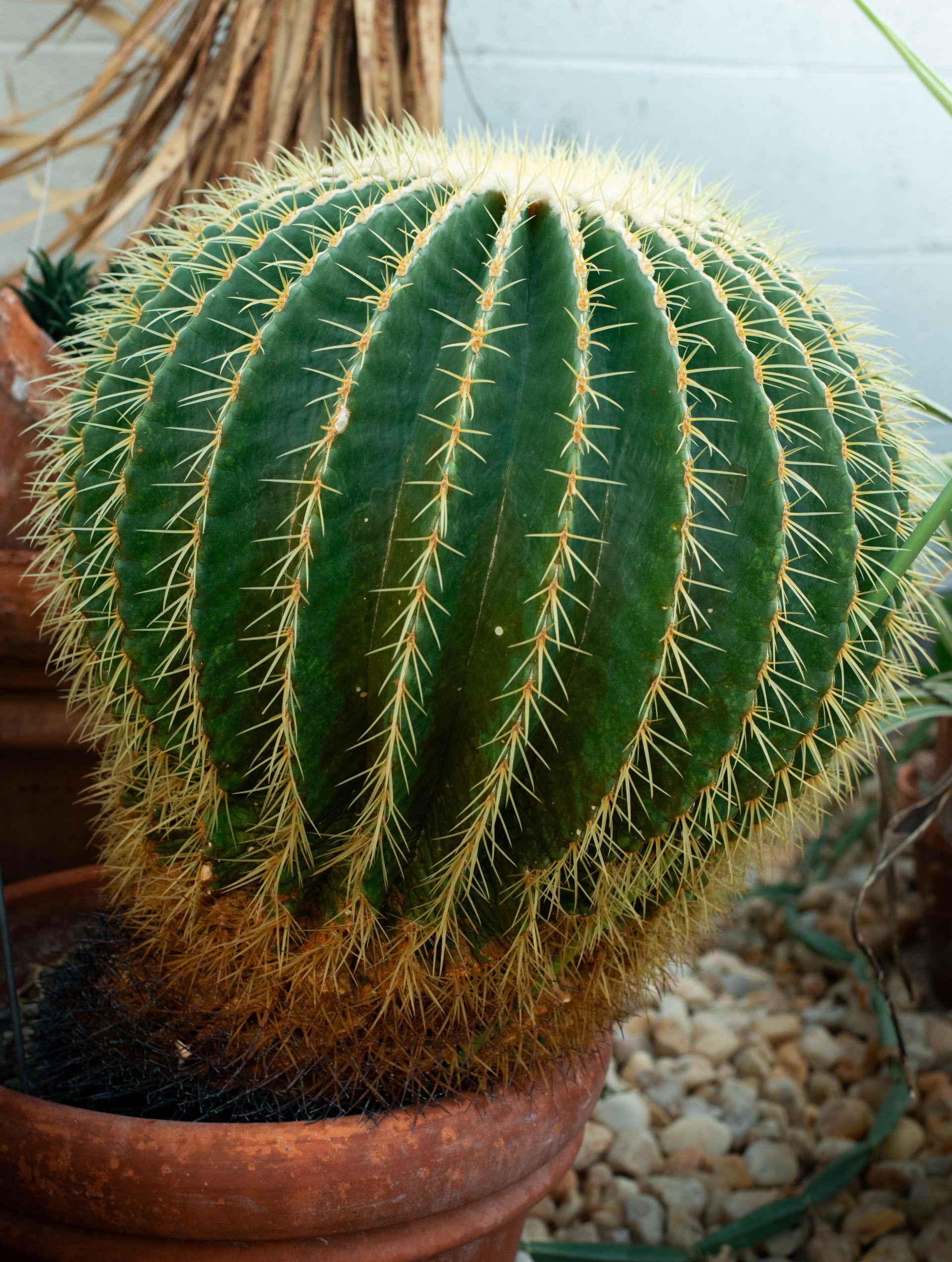 Golden barrel cactus is a cylindrical (globose) succulent covered in dense, thick, curved spines that can grow to roughly 3 inches long. They feature prominent ribbing, which allows them, like many other cacti, to thicken or shrink, allowing them to store water in harsh desert climates. They produce striking yellow flowers along their crown, which in the summer are used to attract pollinators.