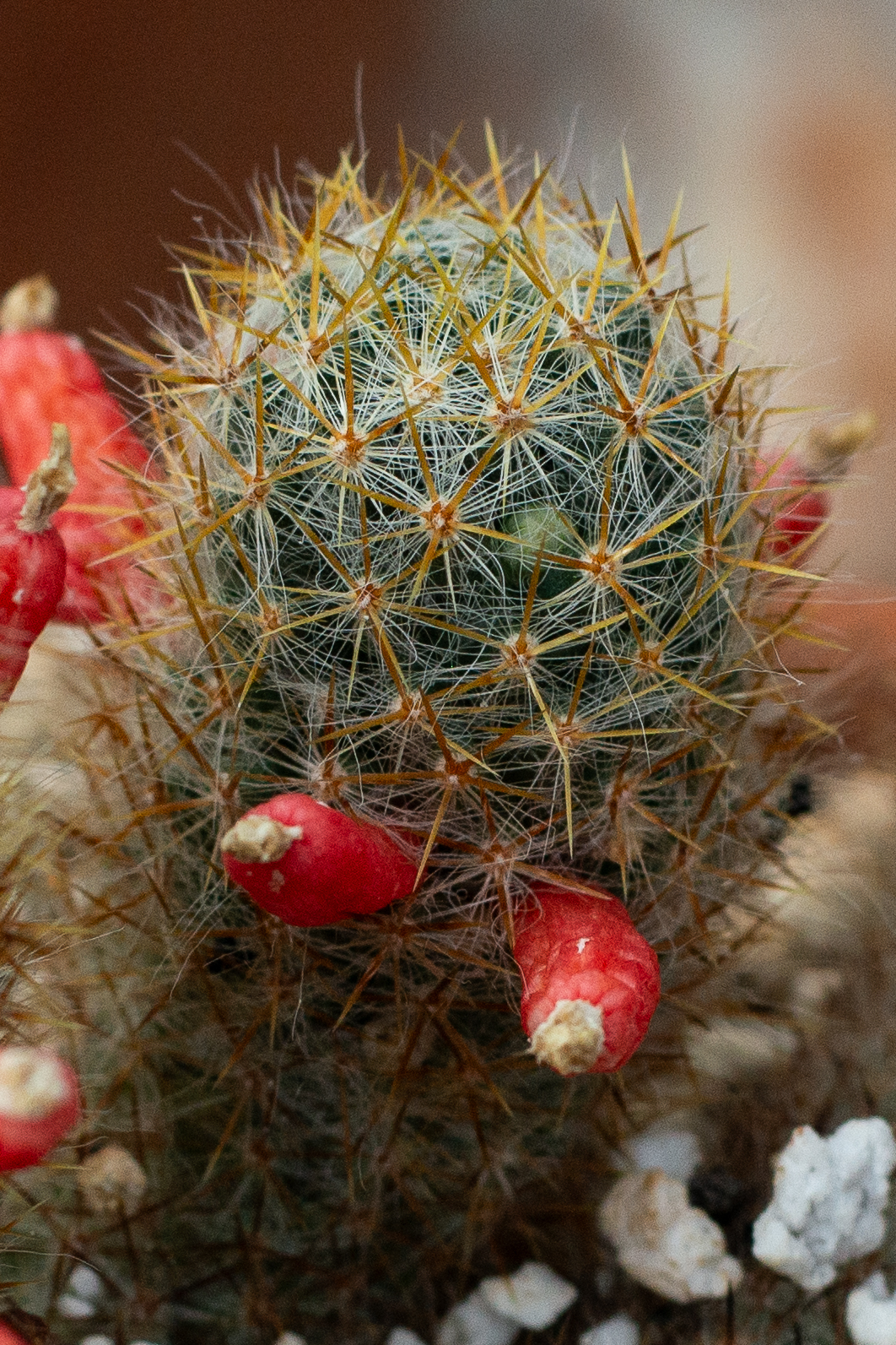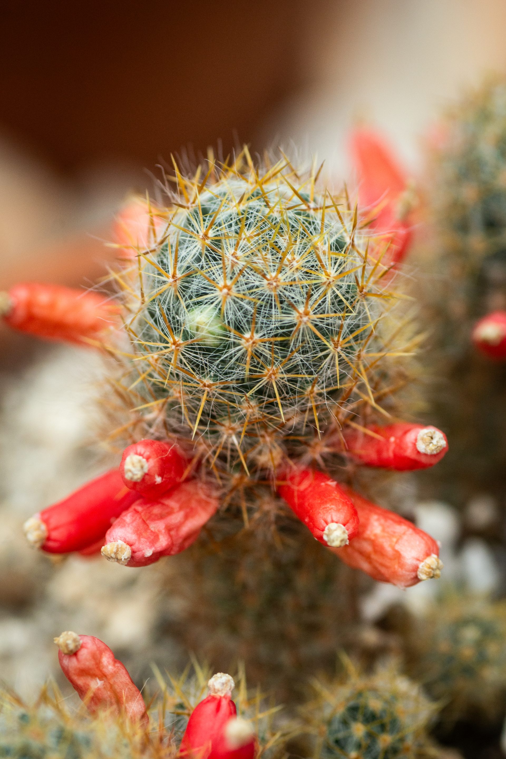 This small cactus is made of densely clustered, elongated stems, which are covered in overlapping, curved yellow and brown spines and thin, hair-like spines. It tends to form short thickets. They flower in the spring and produce small white-yellow flowers (or sometimes pink) along the stem. They are also often covered in an iconic red, elongated fruit.