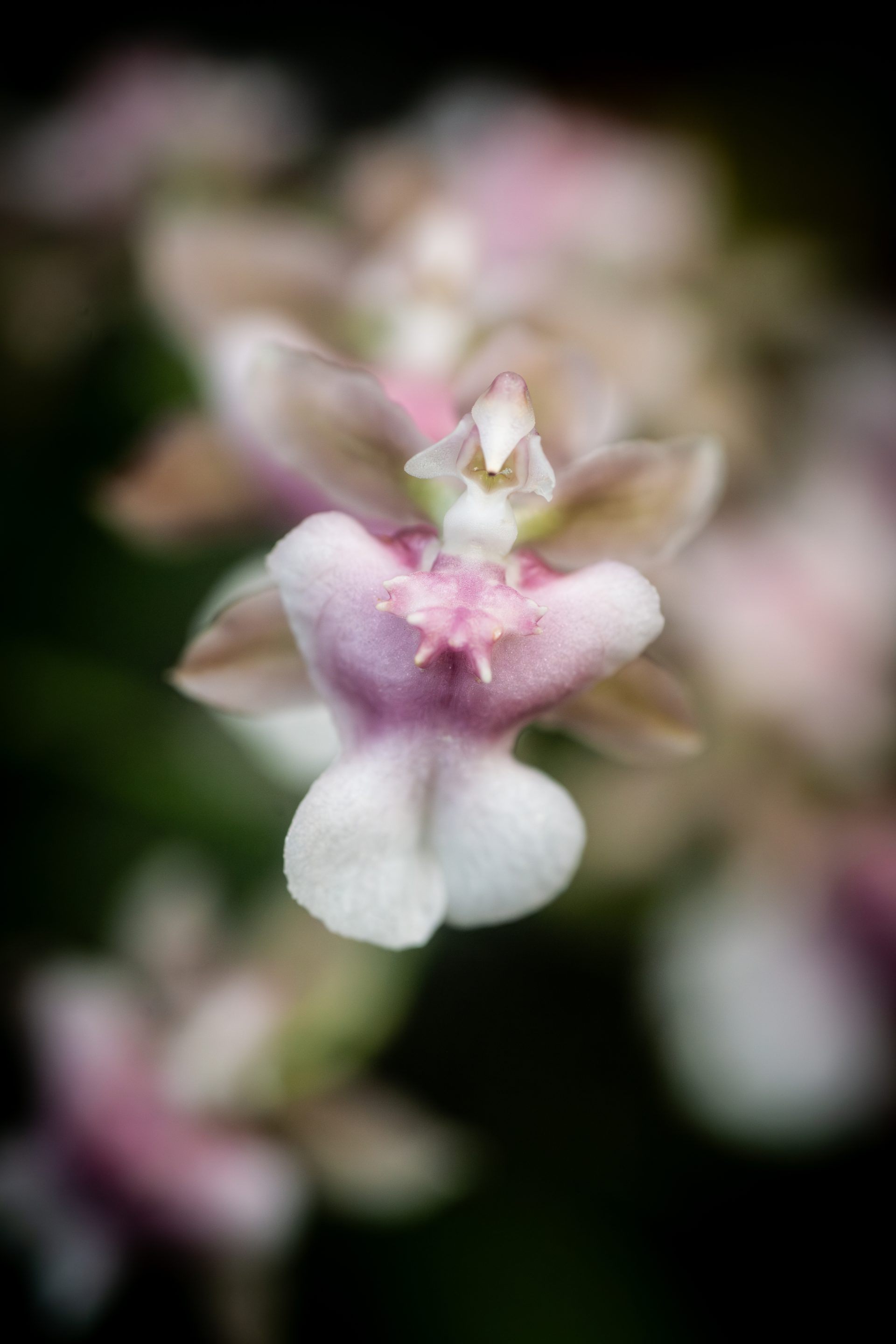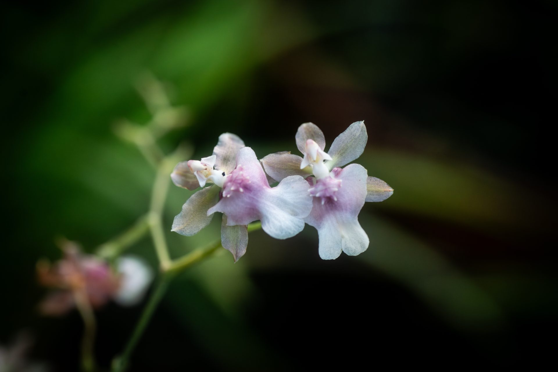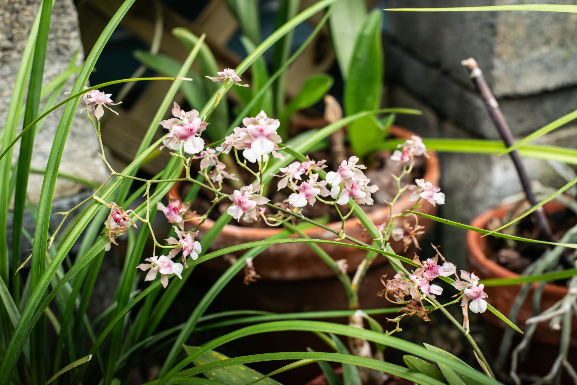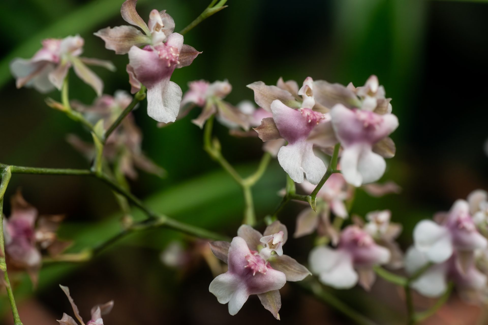 Like many orchid species, Oncidium Rosy Sunset is an epiphytic plant. This one features densely packed spikes of delicate pink flowers with approximately 17 flowers per spike.